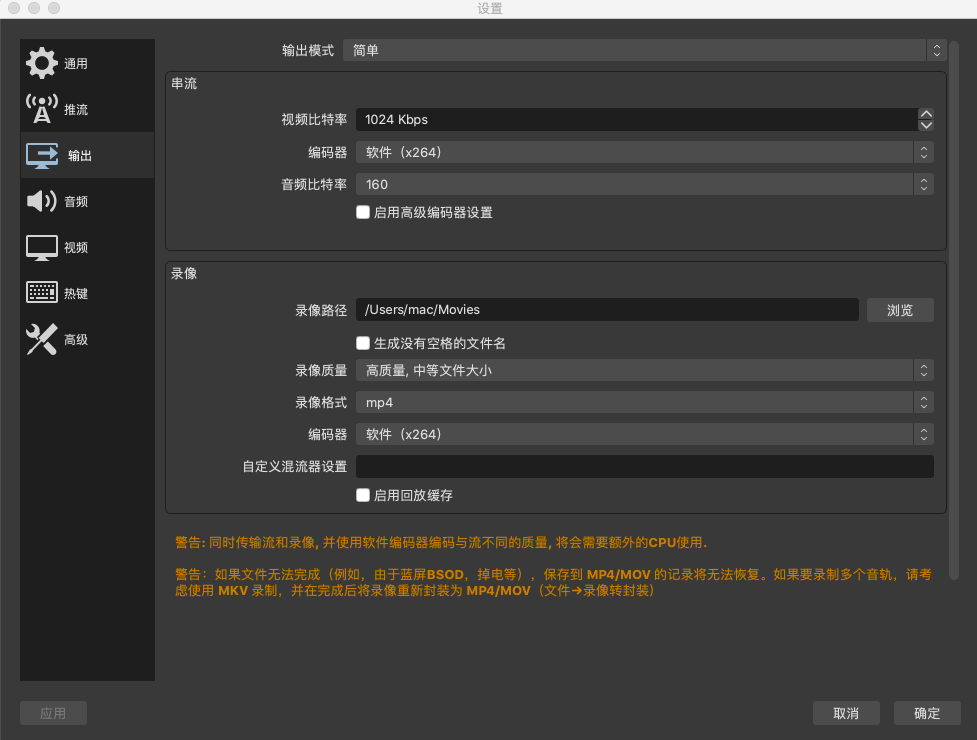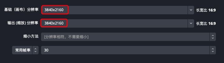 - 分辨率:设置 -> 视频 -> 基础(画布)分辨率和输出(缩放)分辨率,全部设置为 3840x2160(4k),或 2560x1440(2k)。