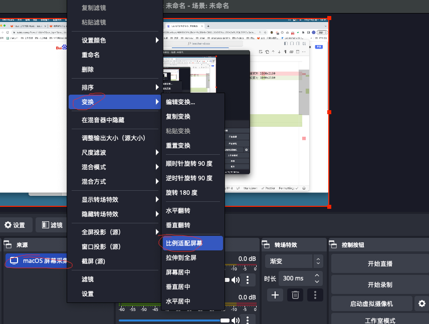 - 设置屏幕比例适配屏幕:屏幕采集(右键)-> 变化-> 比例适配屏幕